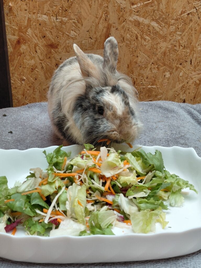 Am liebsten fresse ich Salat, Gemüse, Obst gelegentlich mal und natürlich Heu. Im Sommer Wiese und was der Garten sonst noch so bietet.