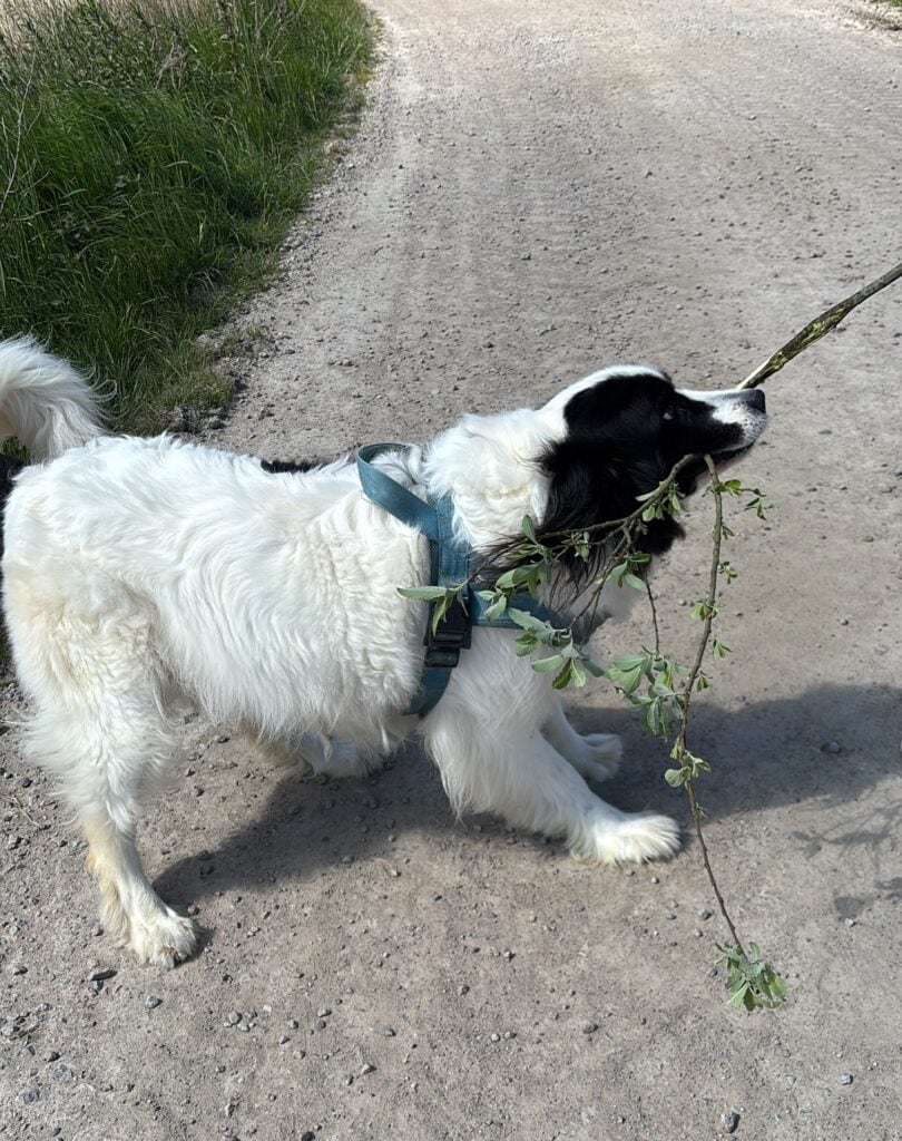 Snowy läuft sehr gut an der Leine und auch ohne Leine. Sie ist sehr gelehrig und gehorsam. Ihre Problemzone sind Fahrradfahrer und Autos. Da springt sie immer wieder mal gerne in die Leine mit einem Bellen. Wir arbeiten daran schon sehr lange. Es gibt Tage, da klappt das super, und dann gibt es Tage, da klappt das nicht so. Auch wenn ihr beim Spaziergang Menschen oder Hunde entgegenkommen, muss sie gleich kund tun, dass sie bellen kann. Nach anfänglichem Beschnuppern ist dann aber alles gut.