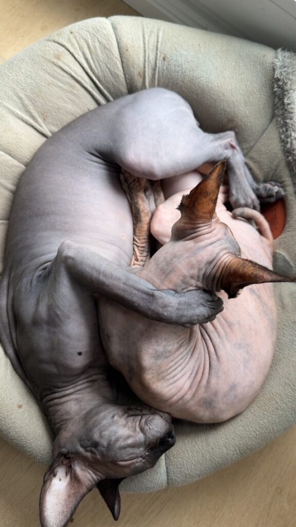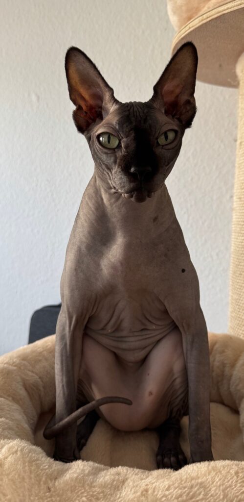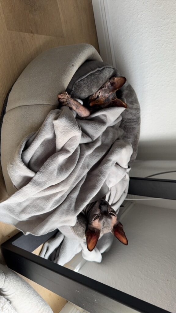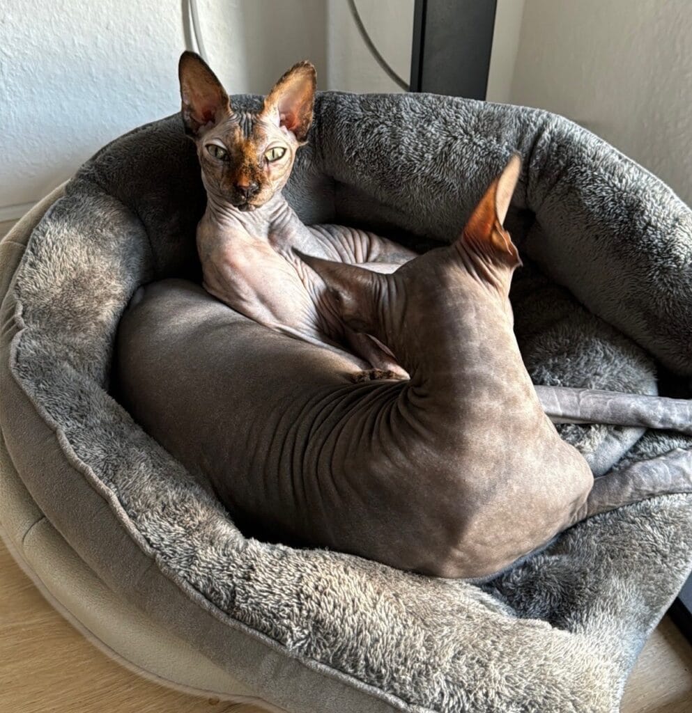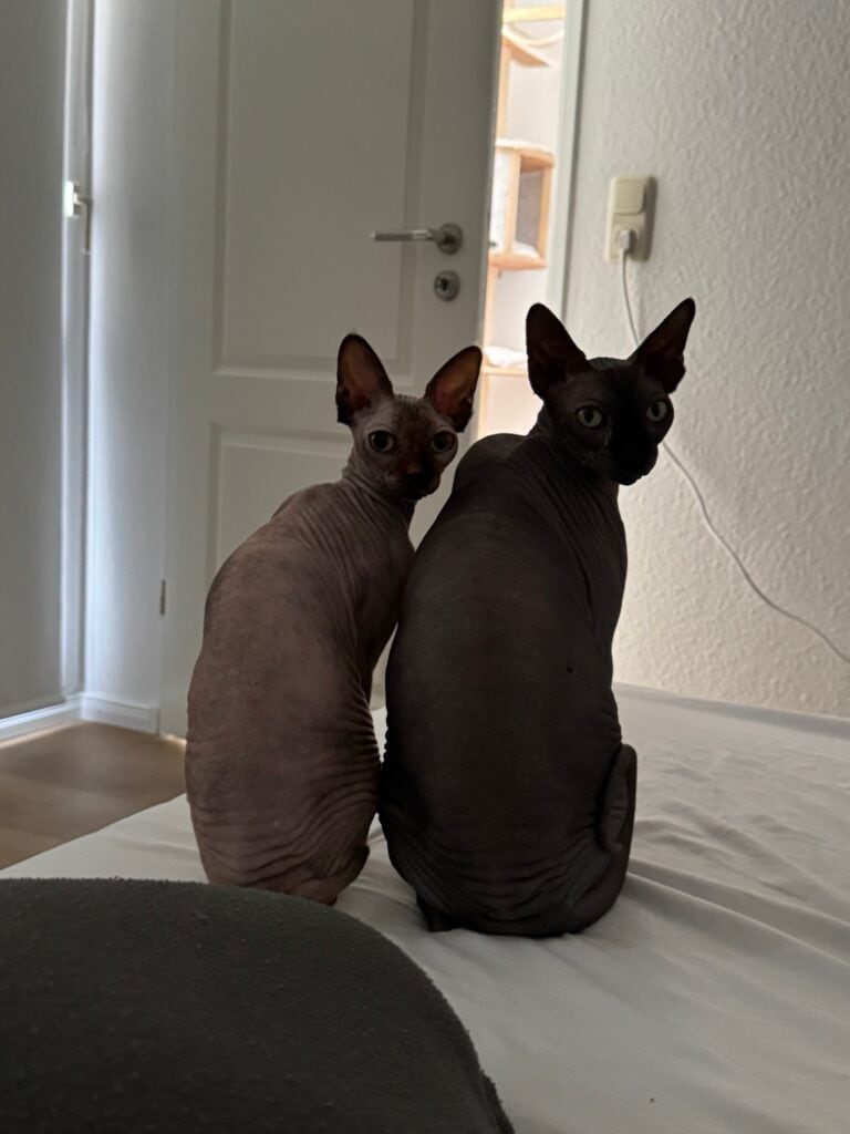 Als Sphynx-Katzen sind sie reine Wohnungskatzen, die viel Liebe und Wärme brauchen. Sie sind an ihre Pflegeroutine gewöhnt und genießen die ungeteilte Aufmerksamkeit dabei sehr.