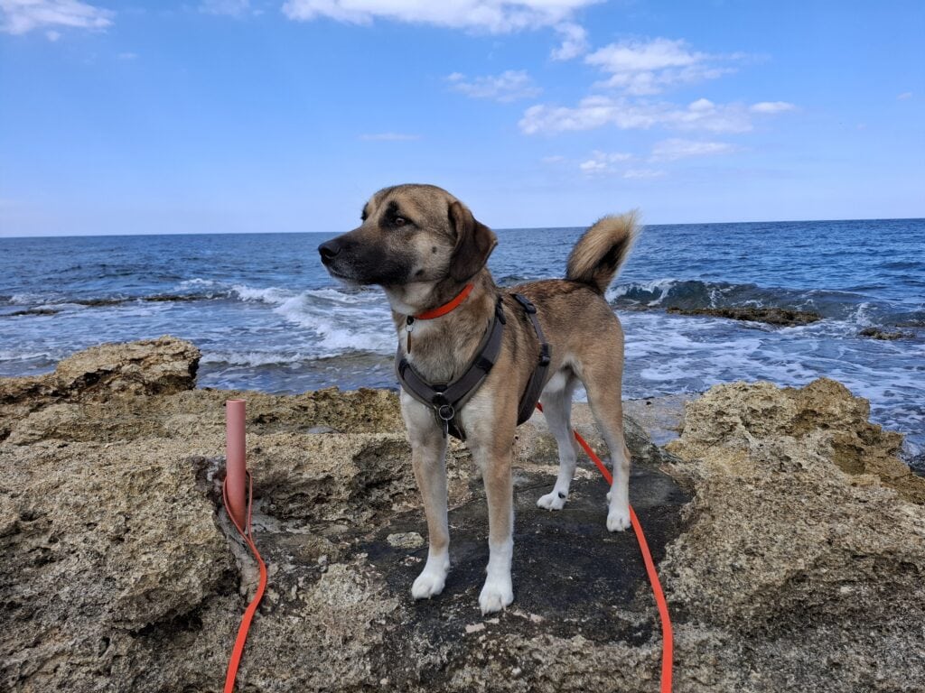 • Hunde: häufig ok mit Hündinnen und kleineren, kastrierten Rüden in ruhigen Situationen. Bei großen, unkastrierten Rüden kann er an der Leine reaktiv werden. Draußen trägt er meist Halti; Maulkorb bei Bedarf.