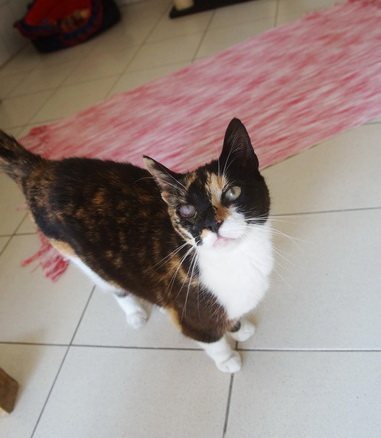 Fundkatze Renate hat ein schlimm entzündetes Auge. Es läuft gelblicher Schleim heraus, ist trüb und kommt wahrscheinlich von einer unbehndelten Bindehautentzündung. Zwei Mal am Tag muss sie nun Augentropfen bekommen. Das findet sie ganz schön doof, aber es nützt ja nix. ð