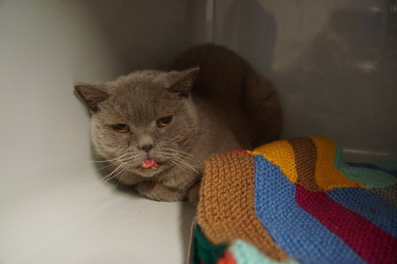 Scampi war vermittelt und hört dort plötzlich auf zu fressen. Da er sich zusätzlich die ganze Zeit versteckt hat, haben wir ihn wieder ins Tierheim geholt. Hier zeigte sich, dass der arme Kater sehr schlimm Herpes bekommen hatte und er vor Schmerzen nicht mehr fressen konnte. Mittlerweile ist er medikamentös eingestellt, aber die Genesung dauert lange. Mittlerweile frisst er sein eigens püriertes Futter aber schon wieder ratzeputz weg.. – hoffen, wir, dass es jetzt schnell bergauf geht.