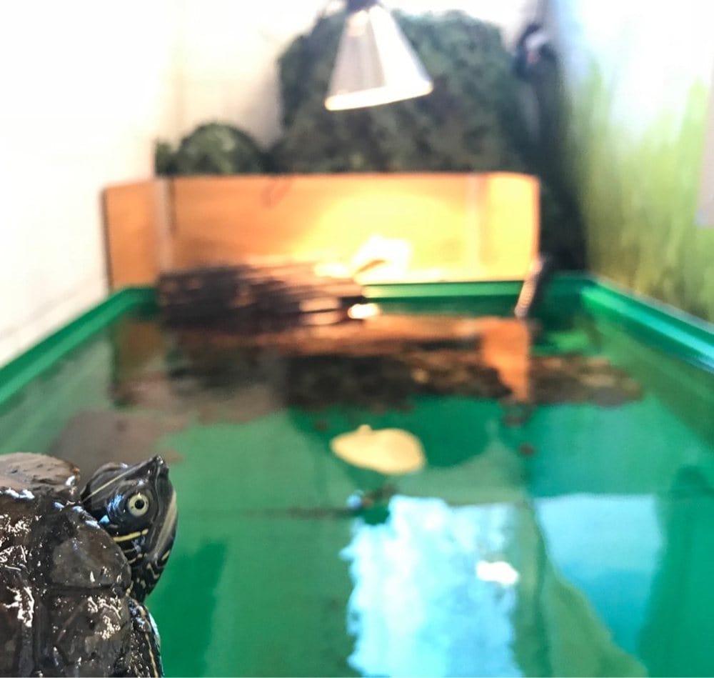 Unseren Wasserschildkröten ist es im Winter draußen eindeutig zu kalt, weswegen im Kleintierhaus eine kleine Überwinterungsoase gebastelt wurde. Die Kröten haben dort ein schönes Wasserbecken, einen Sonnenplatz und eine Holzrampe zum klettern. Sobald es draußen im Frühjahr wieder warm genug ist, dürfen sie zurück in ihren Teich.