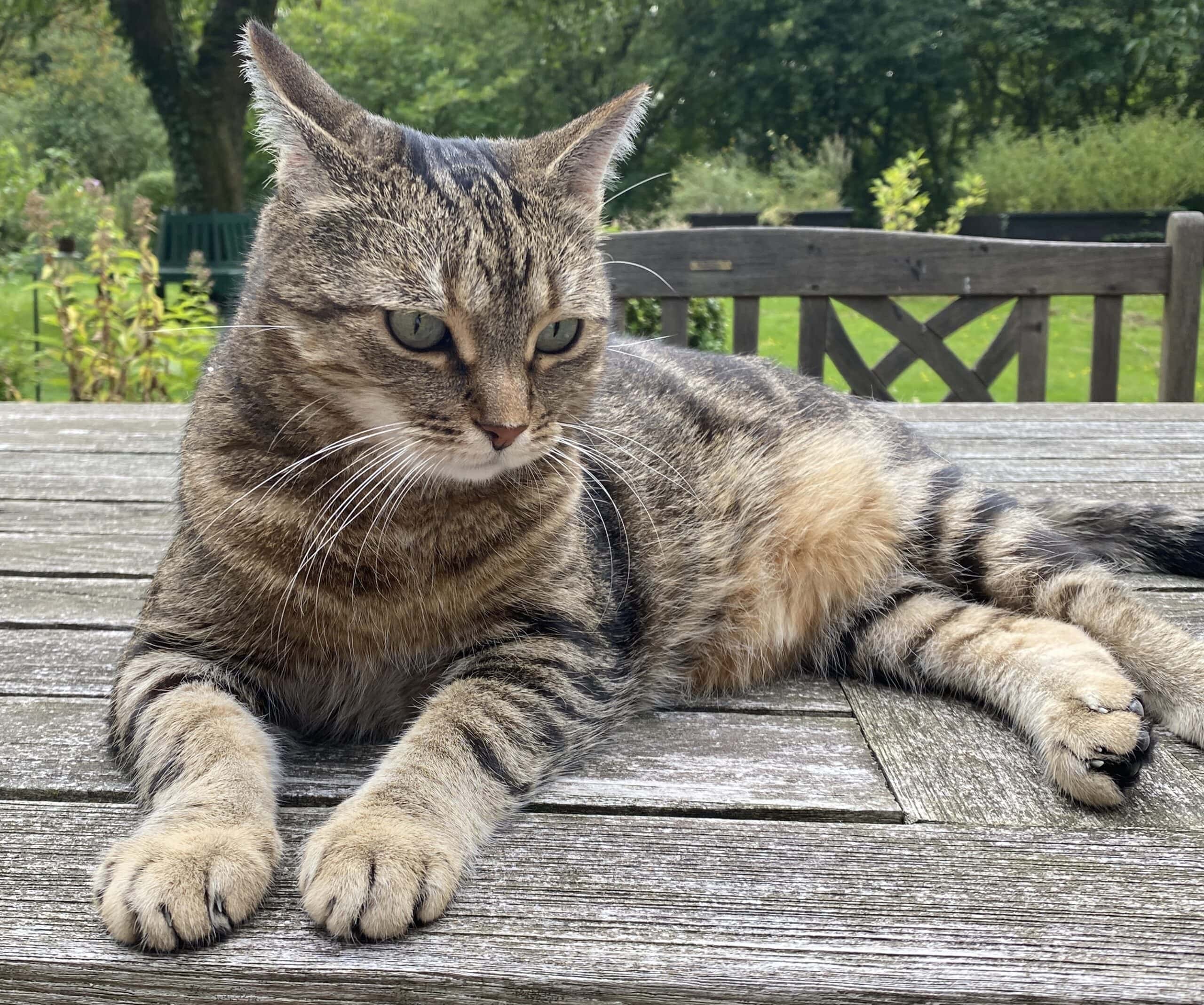 Elsa hat einen kleinen Hängebauch und sie trägt ein graues Floh-Halsband. Durch einen Sturz hat sie außerdem einen verheilten Brustbeinbruch, der als kleiner Knubbel fühlbar ist, wenn sie auf dem Rücken liegt. Elsa ist draußen normalerweise zurückhaltend, drinnen jeden sehr verschmust.