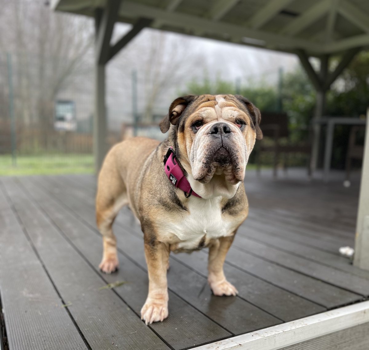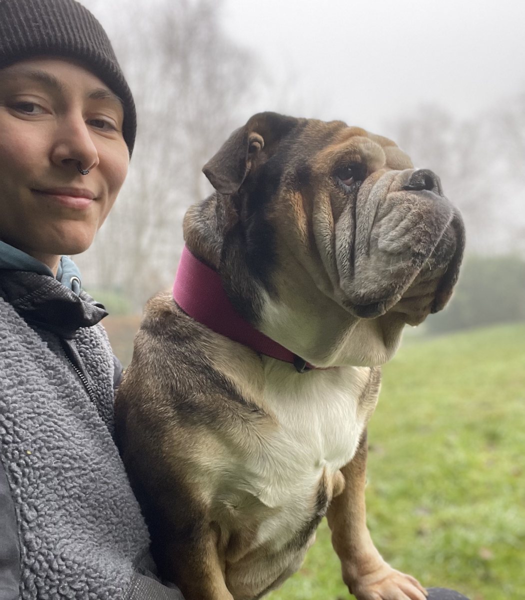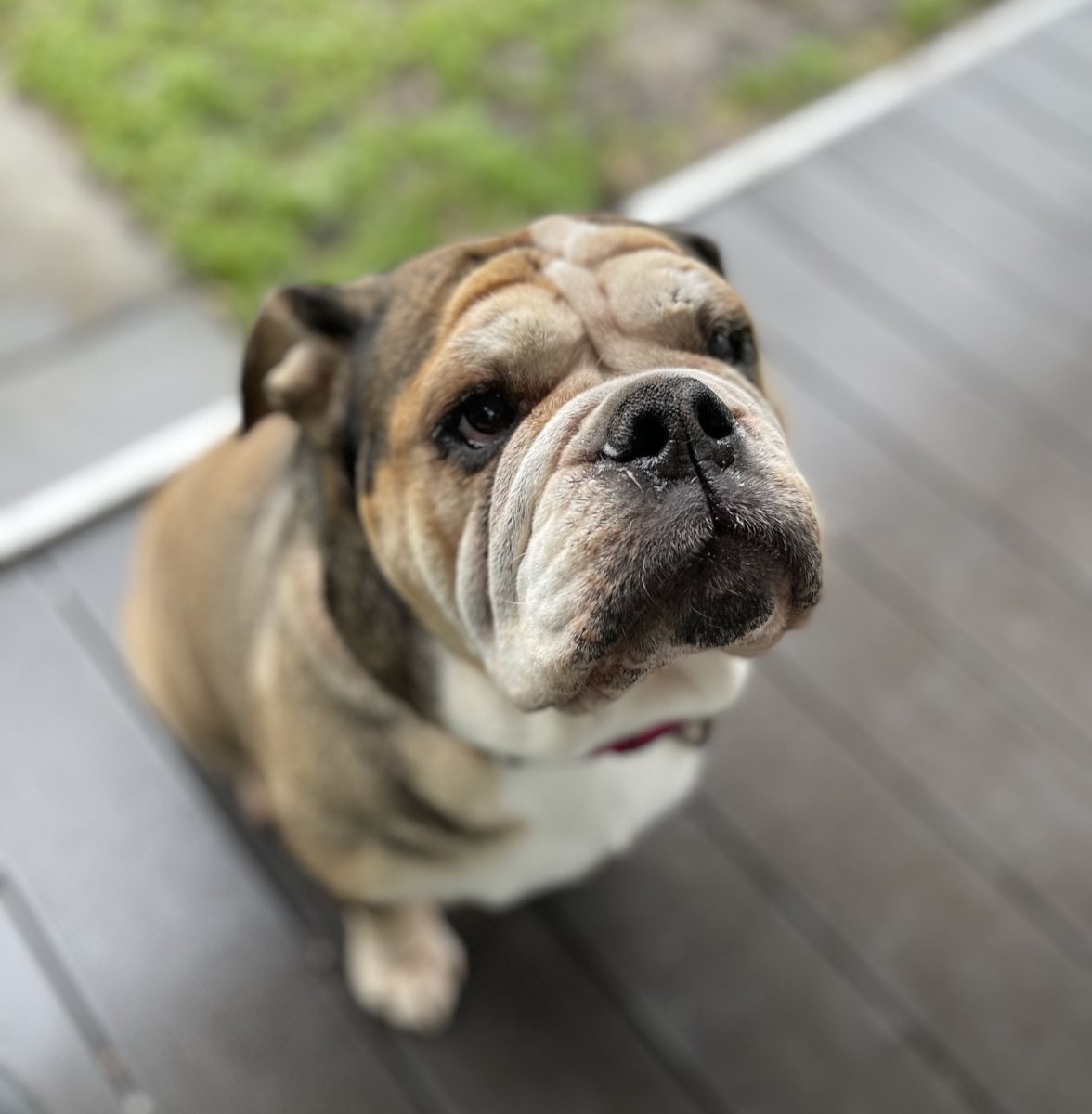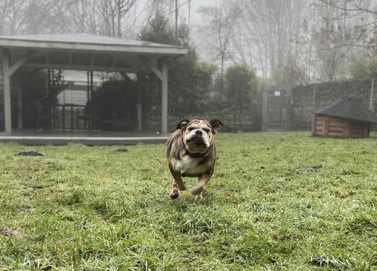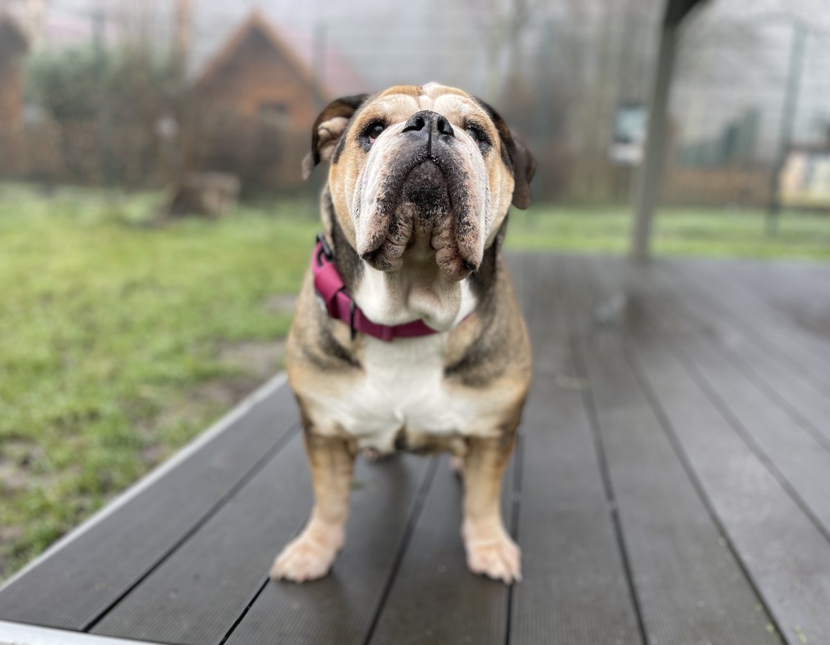 Bulldoggentypisch hat Betty mit Falten und zu viel Haut gerade im Gesicht zu kämpfen. Daher braucht sie Hilfe bei der „Faltenpflege“ und macht das auch lieb mit.