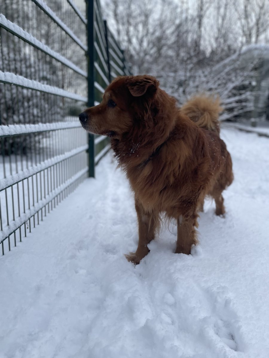 Hier durfte er erstmal ein paar Tage in Ruhe ankommen, und mittlerweile liebt er seine Hundepfleger*innen, geht mit seinem Gassigänger spazieren und liegt am liebsten den ganzen Tag draußen und passt auf, wer da so auf dem Gelände unterwegs ist.