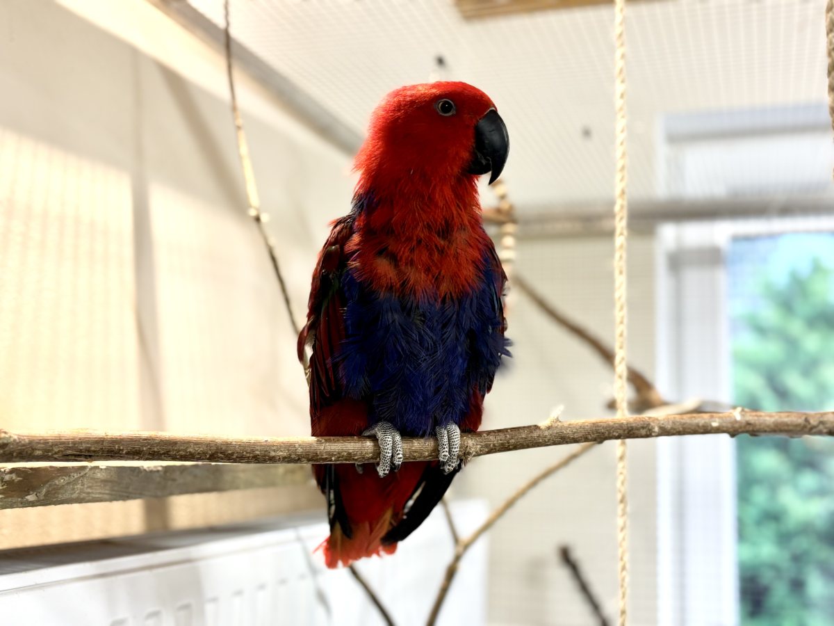 Ich bin ein ganz ruhiger Geselle, der auch immer neugierig meinen Pflegern hinterher klettert. Meine rote Gefährtin allerdings findet diese federlosen Zweibeiner noch etwas gruselig. Sie beschäftigt sich lieber mit ganz viel Spielzeug, dass sie kaputtmachen kann und beschwert sich, wenn nicht sofort neues bereit gestellt wird. Mit etwas Zeit und Vertrauen werden wir aber beide bestimmt noch ganz nett.