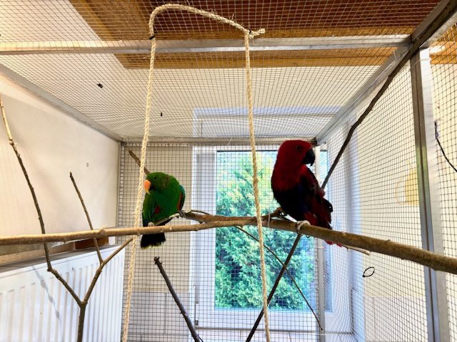 Da wir aus nicht so schöner Haltung kommen, sind wir nun auf der Suche nach unserem eigenen traumhaften Palast! Wichtig ist, dass wir viel Platz haben. Unsere Voliere sollte mindestens zehn Quadratmeter groß sein mit vielen Spiel- und Klettermöglichkeiten. Fliegen können wir beide zwar noch nicht so wirklich, möchten es aber unbedingt noch lernen!