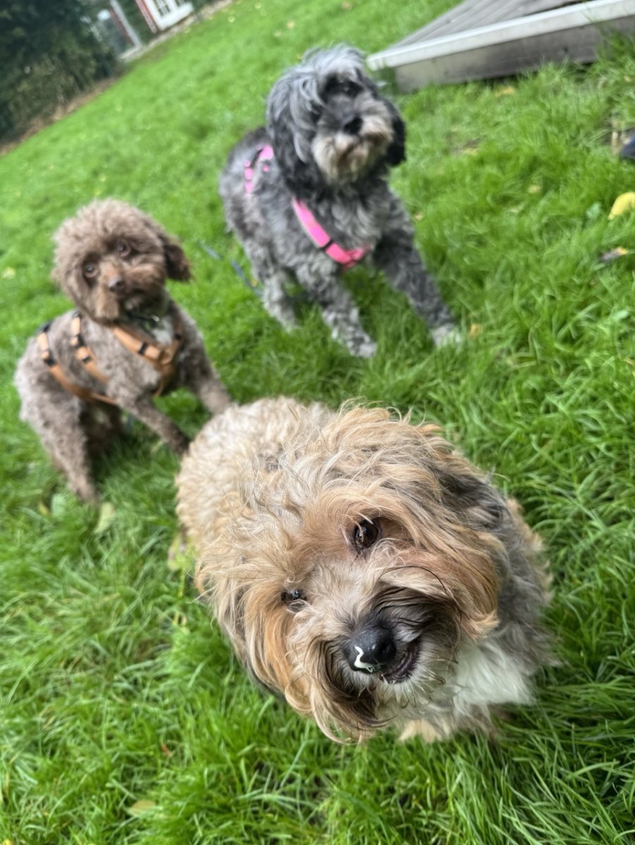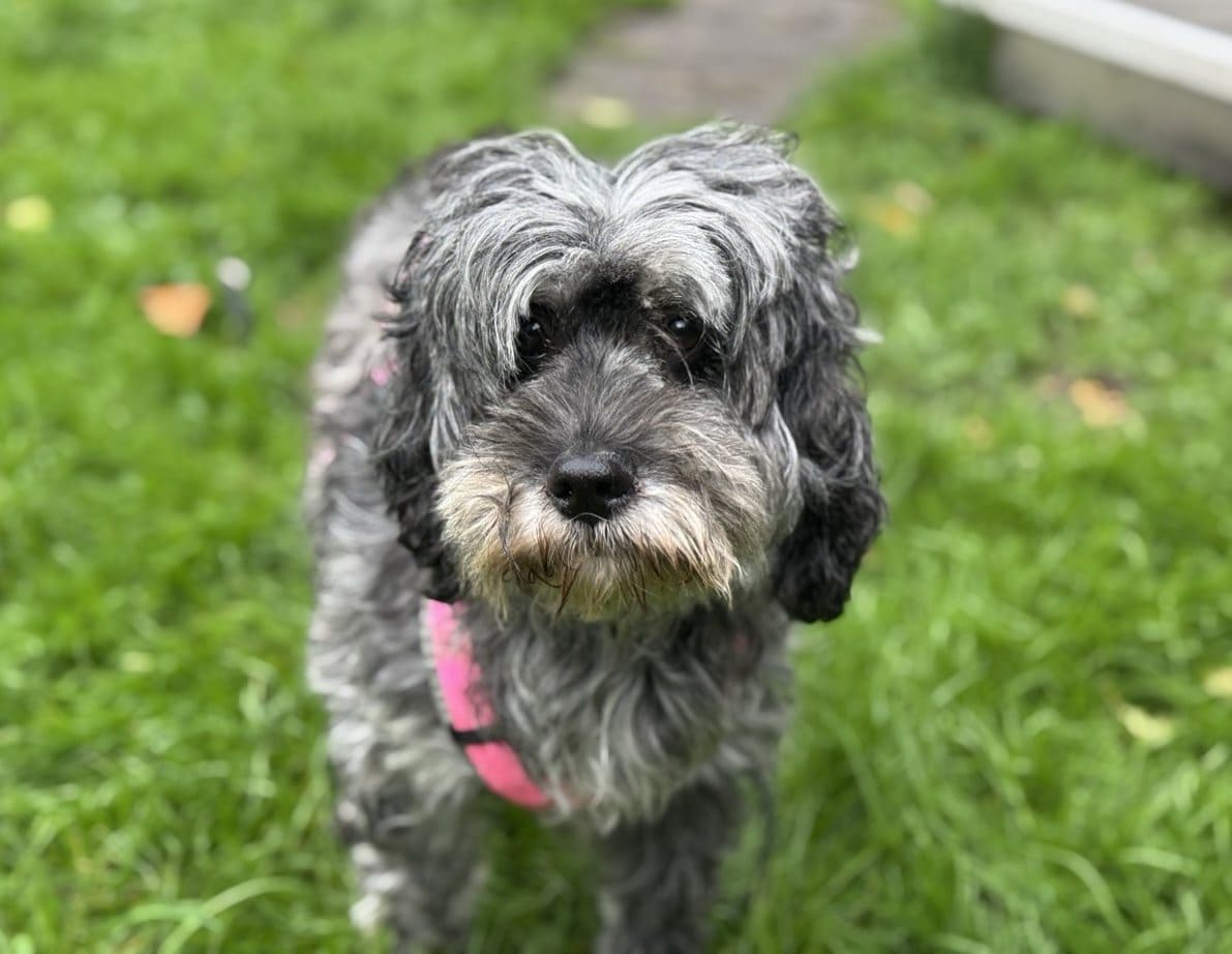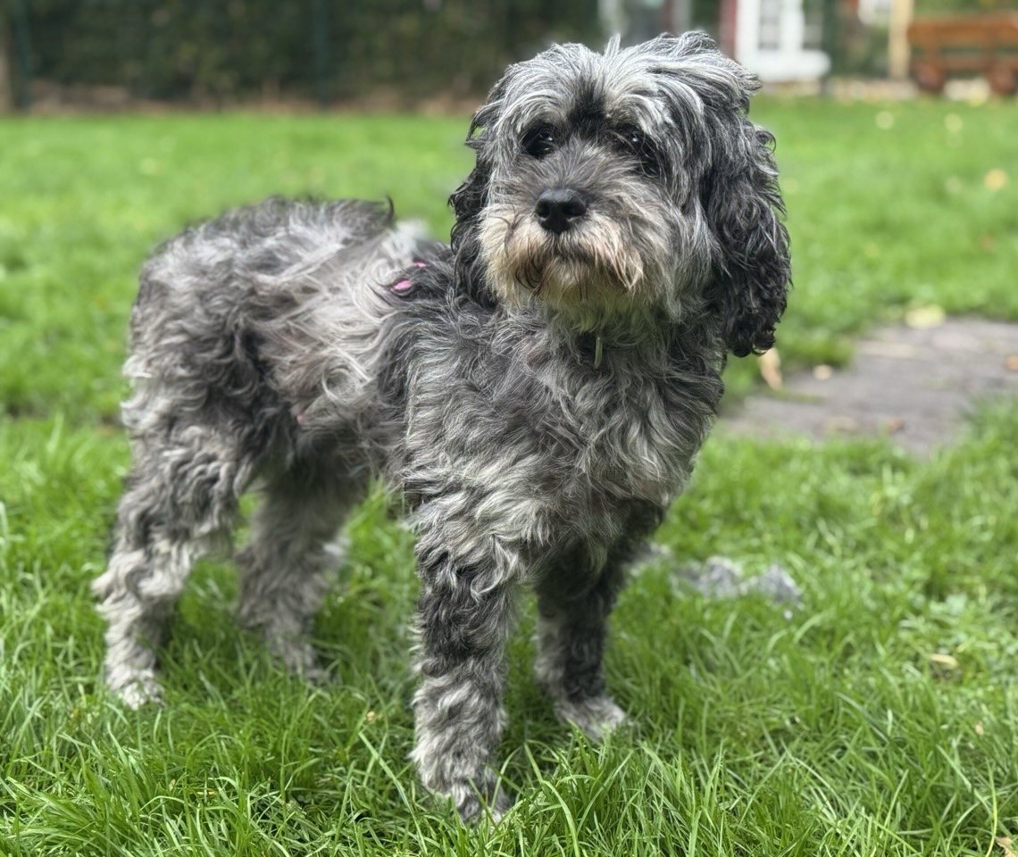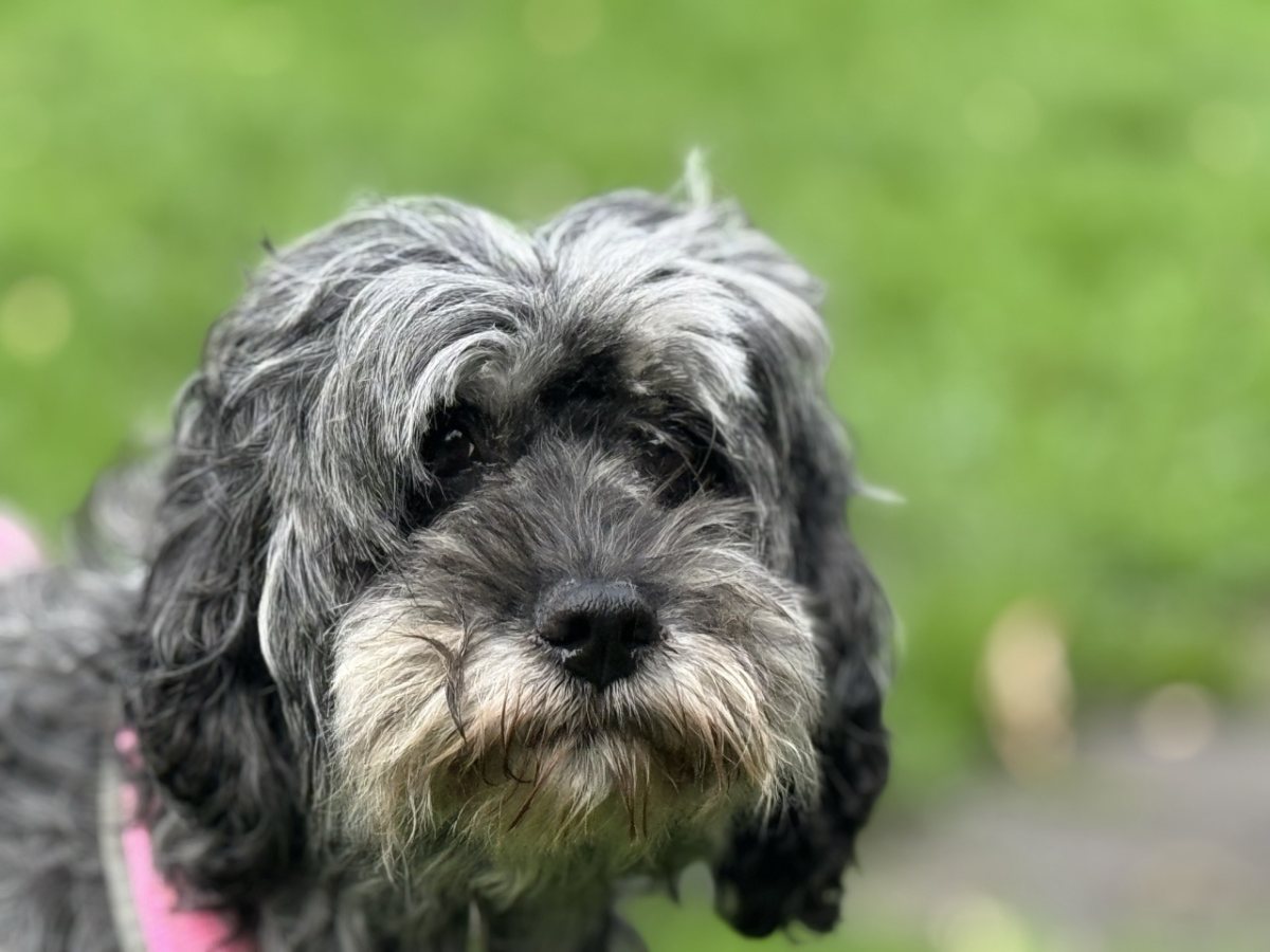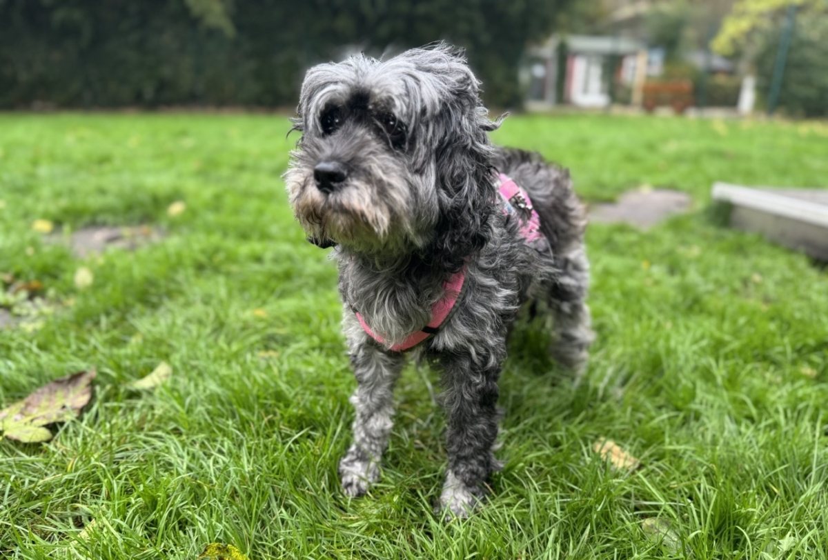 Lolas Fell wächst ordentlich und muss regelmäßig gepflegt werden. Die „Gardinen“ über ihren Augen sollten auch immer mal wieder gekürzt werden, sonst sieht die süße Hündin nichts mehr.