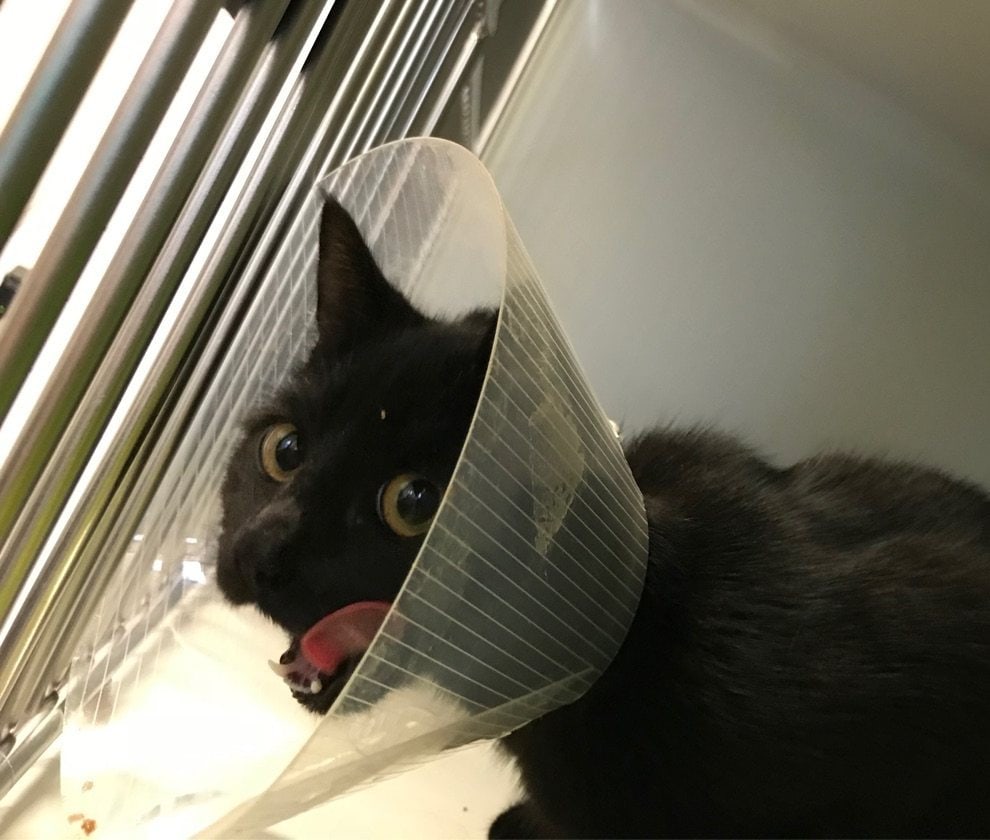 Die kleine Toka hat ihre Kastrawunde beschleckt, sodass diese sich entzündet hat. Damit sie schnell wieder gesund wird, bekommt sie Schmerzmittel und ein Antibiotikum und zur Sicherheit muss sie einen Trichter aufsetzen. Zum Glück findet sie das alles gar nicht so schlimm und freut sich über jeden, der sie einmal schnell streichelt. ;-)
