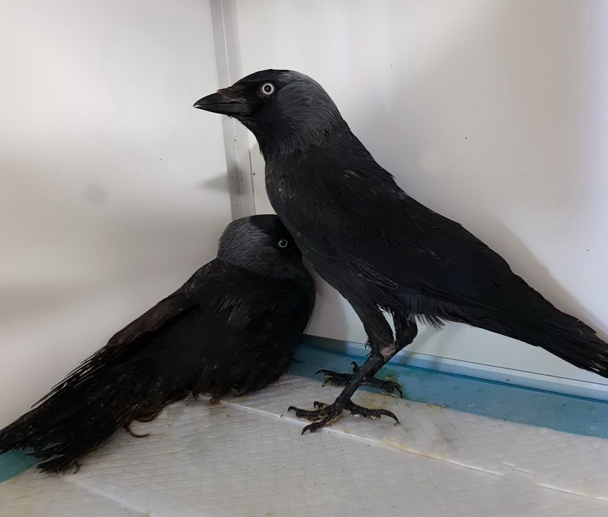 Böse und Trottelchen sind zwei ganz arme Dohlen. Dem einen fehlt ein Stück vom Flügel, dem anderen ein Bein. Beide sind also zwei Invaliden, die draußen ohne menschliche Hilfe nicht überleben würden. Sie werden bei uns jetzt noch gepäppelt und liebgehabt (naja, Böse hat seinen Namen nicht ohne Grund ;-)) und dann wollen wir mal sehen, was wir mit dem Dohlenzirkus anstellen…