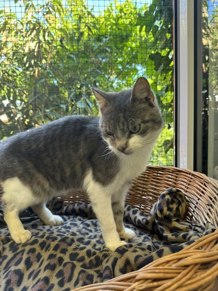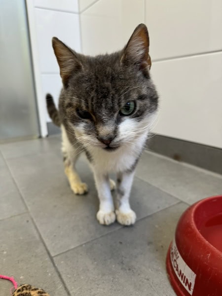 In einem Gewerbegebiet lief Vin Diesel herum und schien nicht mehr ganz so fit zu sein. Deshalb fuhr eine Kollegin los, um zu sehen, was da wohl dahintersteckt. Schnell zeigte sich, dass etwas nicht stimmte mit dem jungen Kater. Er wurde eingefangen und direkt zu unserer Tierärztin gebracht. Dort stellte sich schnell heraus, dass der kleine Vini nicht mehr richtig gucken kann, er hat neurologische Ausfälle, ist apathisch und roch ganz schlimm nach einer Art von Treibstoff. In der Praxis wurde der kleine Mann gebadet, geröntgt, ein Blutbild wurde gemacht und er hat eine Infusion bekommen.